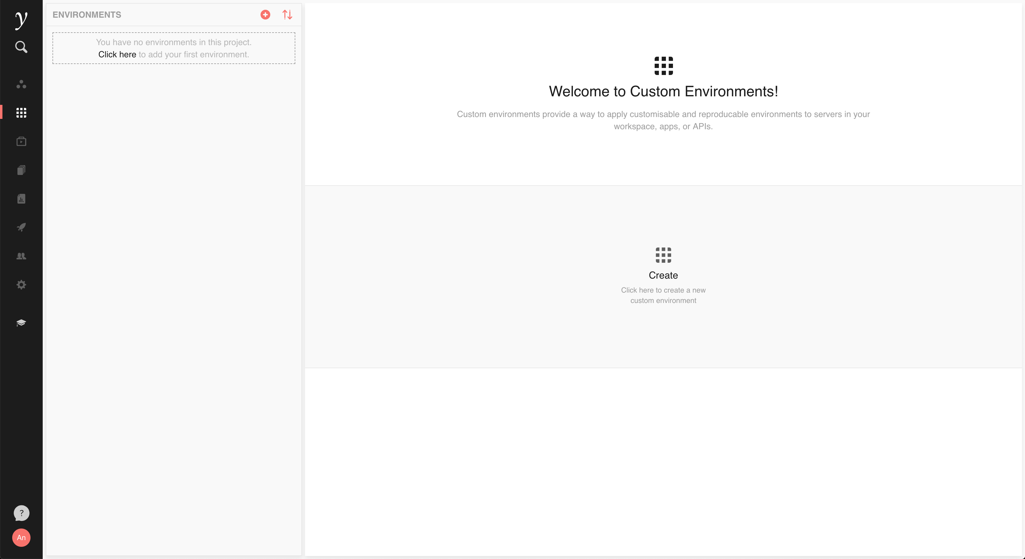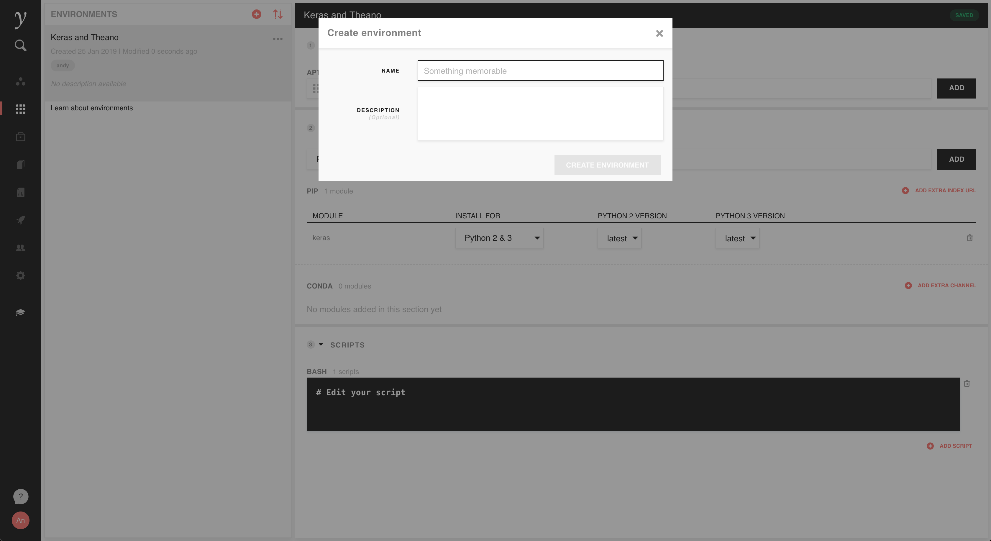 Let’s walk through the example of creating a custom server environment to install the Theano and Keras machine learning libraries. To create a custom environment, go to the Environments tab and click to add your first environment.