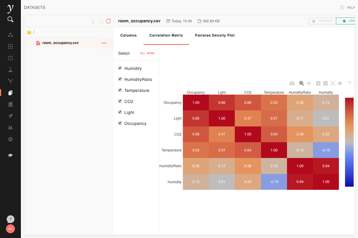 Faculty also runs Lens on CSV and TSV files uploaded to Datasets. To use this feature, select the file in Datasets and select LENS in the upper right corner. Once the report is generated, you’ll be able to explore the report in the Faculty UI: