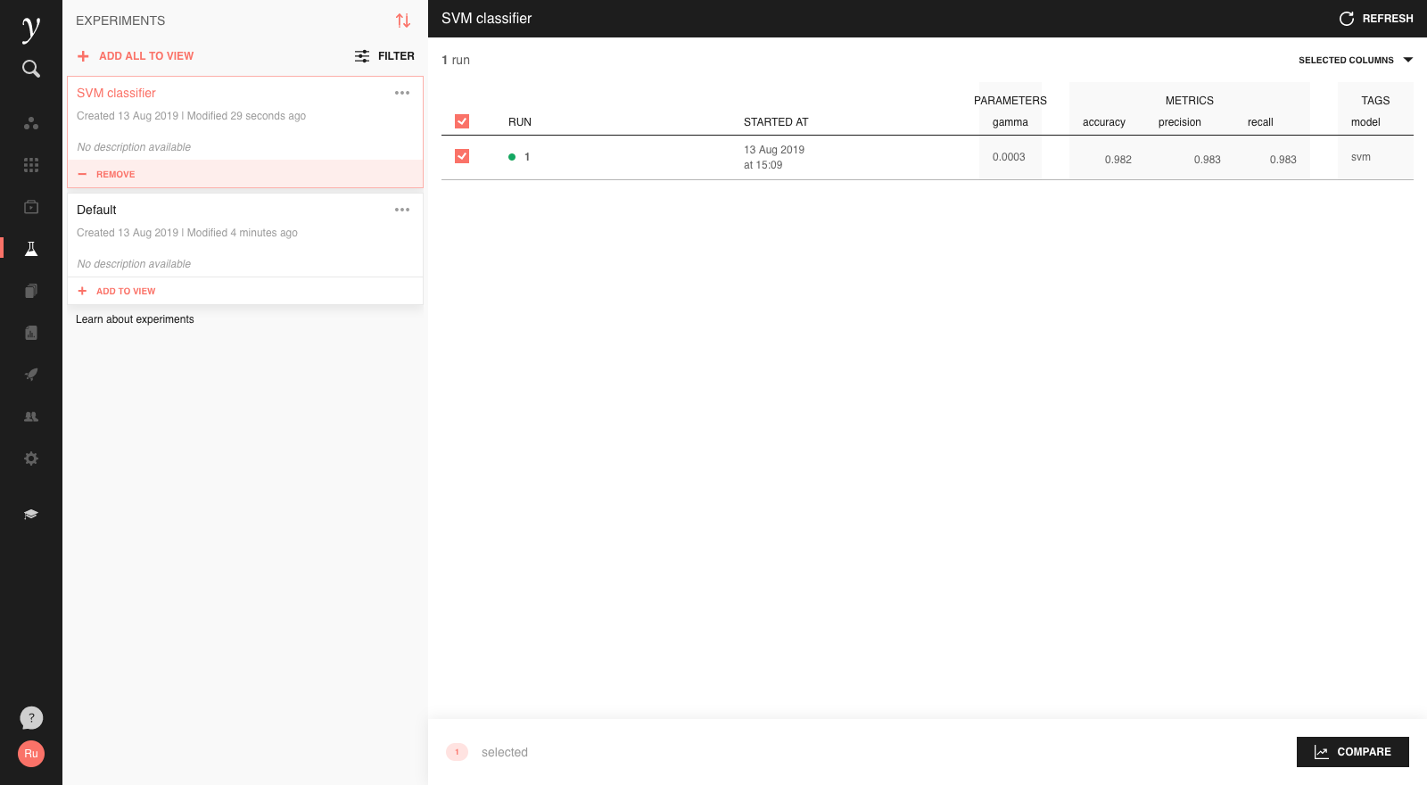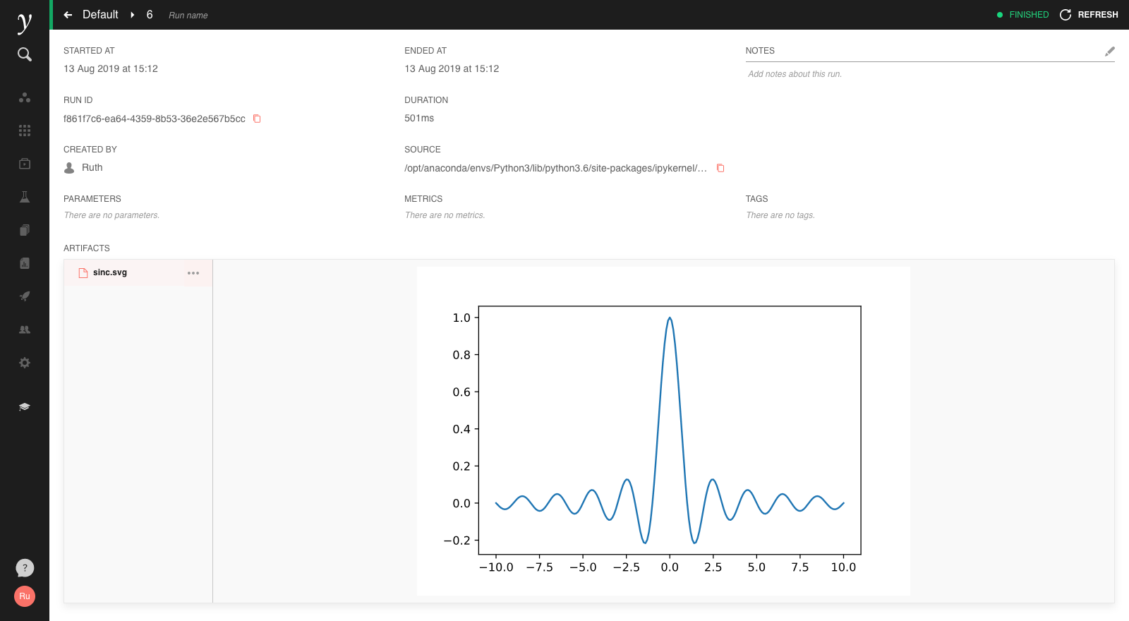 This will create a new run in the ‘Default’ experiment of the open project, which you can view in the Experiments screen: