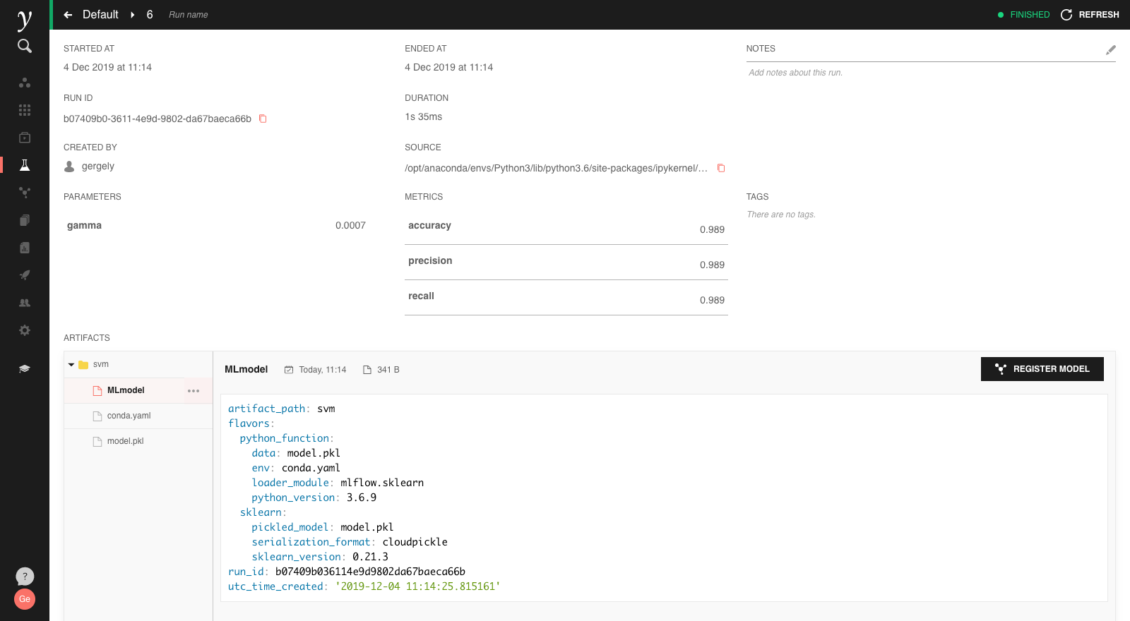 The model will then be stored as artifacts of the run in MLflow’s MLmodel serialisation format. Such models can be inspected and exported from the artifacts view on the run detail page: