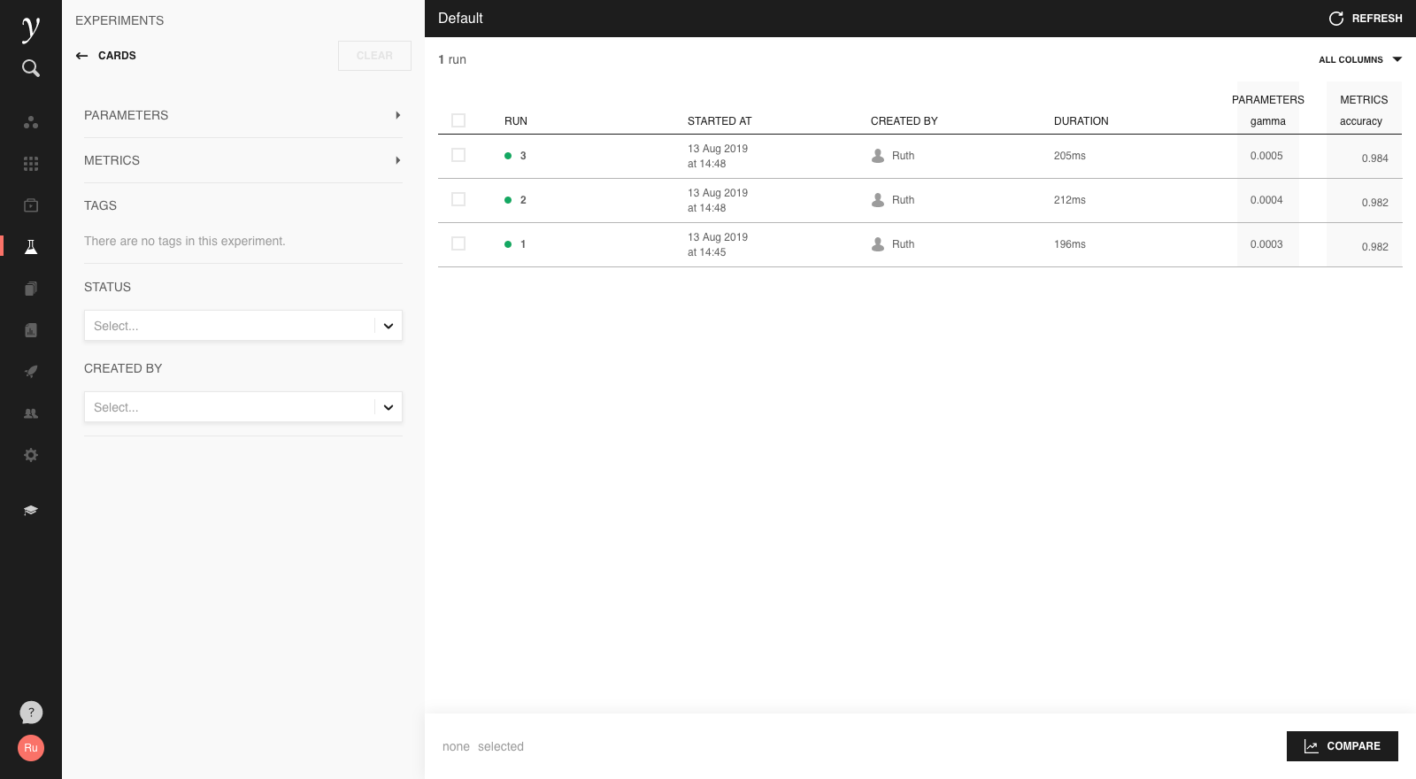 If the experiment does not already exist, it will be created for you and appear as a new card in the run history screen: