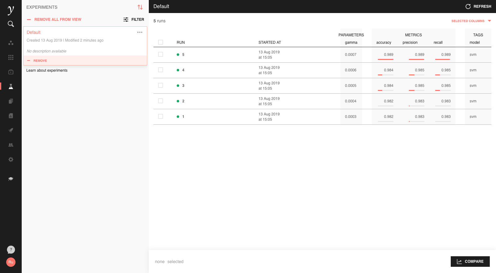 For more detail on how to use the experiment tracking feature and MLflow, have a look at the MLflow documentation.
