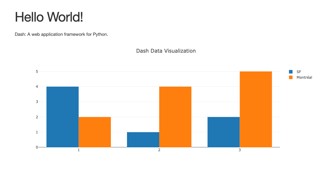 When you have a valid configuration, click “Add to project” to apply it. Once applied, the project will be opened and you can start using the created resources. In the above example, I can navigate to the “Apps” section of “Deployments” and start the app that has been created. It starts a minimal working example of a Plotly Dash app, as expected: